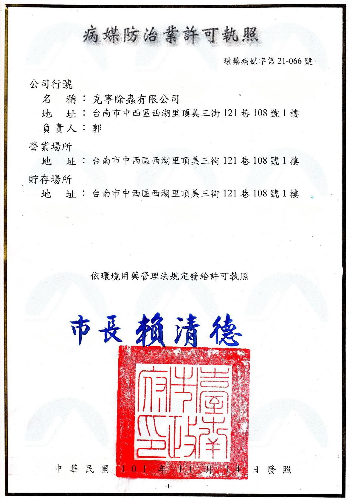 病媒防治業許可執照-環藥病媒字第21-066號