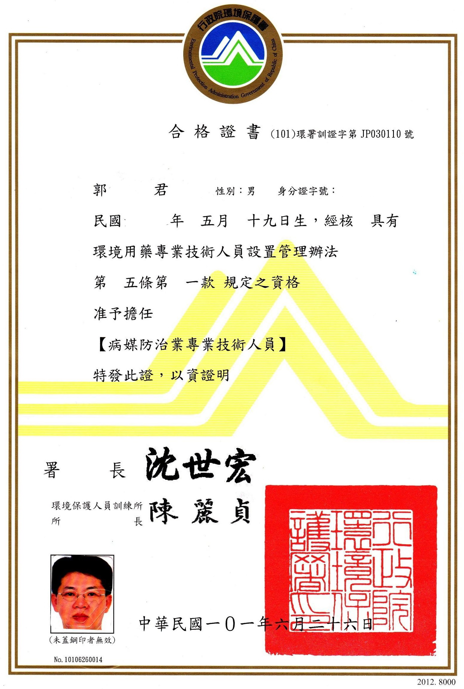 環境用藥專業技術人員環署訓證字第JP030110號